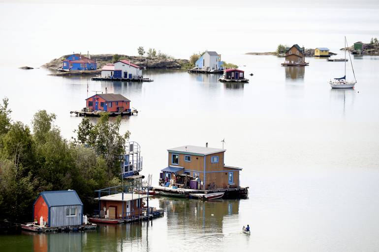 Experience a perfect summer day with this captivating limited edition print, "Houseboat Bay." This stunning photograph captures the unique community of Yellowknife, Northwest Territories, where people live year-round on charming houseboats. Imagine their tranquil lives, reaching their homes by canoe...