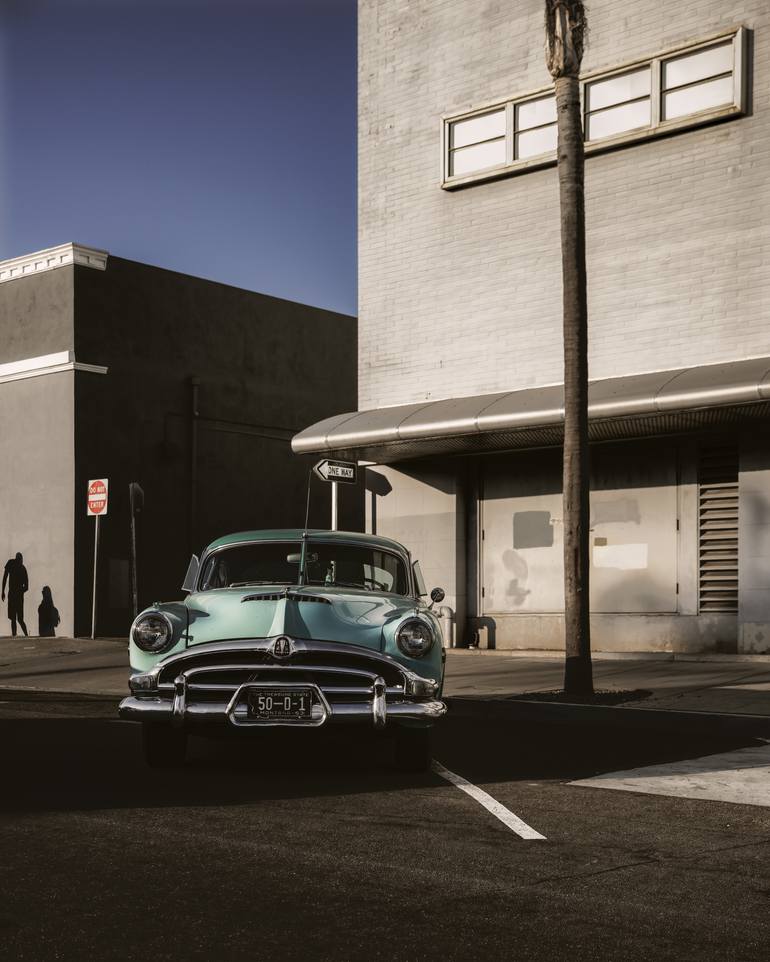 A turquoise 1953 Hudson Hornet catching the last light of the afternoon in downtown San Diego, CA.