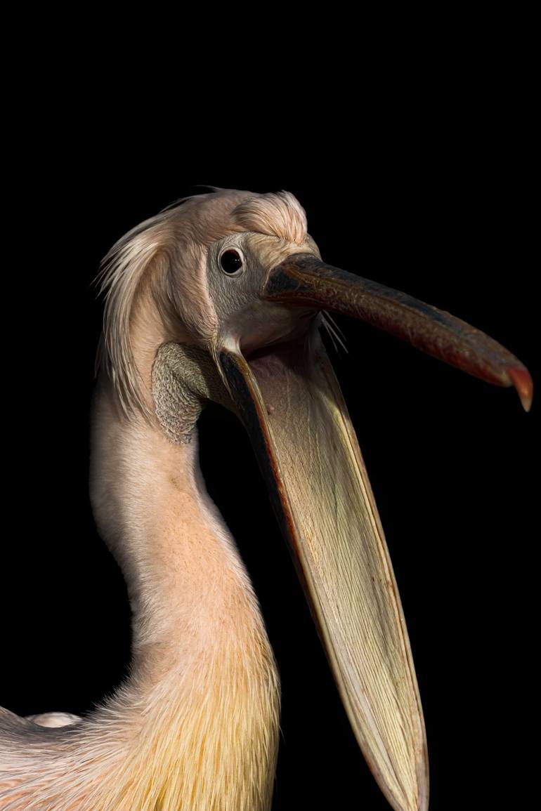 Artistic photo of a pink pelican calling for food and attention. Processed on a black background so that her feathers and the soft pastel colors are extremely visible behind an acrylic plate. Such a work of art works well in reception areas, a hall and spaces that radiate a certain form of tranqui...