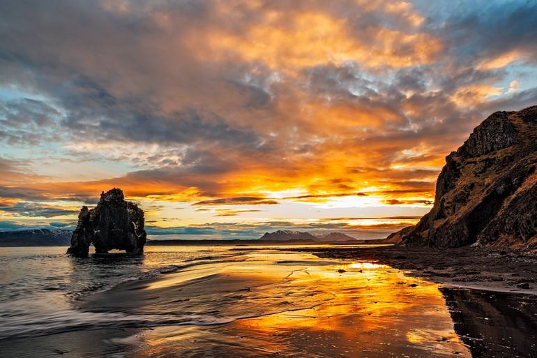 The first time I visited Hvíserkur, in northwest of Iceland, has been 1995 and I was impressed to see this big rock in the ocean. I came back in 2018 to visit it again and shoot it in the sunrise. The light in that morning was fantastic as well as the sky. The low tide allowed me to stay in the righ...