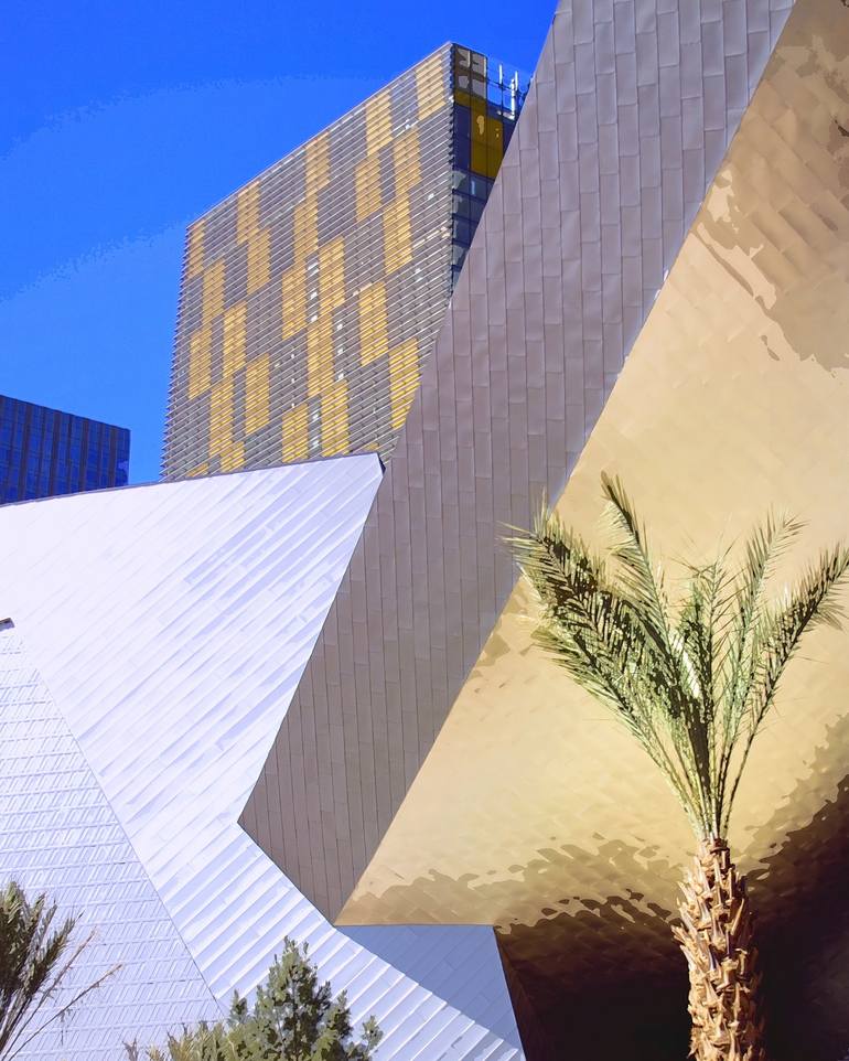 The iconic Shops at Crystals Las Vegas, a curated collection of over 50 of the finest luxury brands in the world, located in the heart of the Las Vegas Strip, captured by photographer William Dey. A painterly impressionist effect added to enhance the desert environment and glass quality. Image is pr...