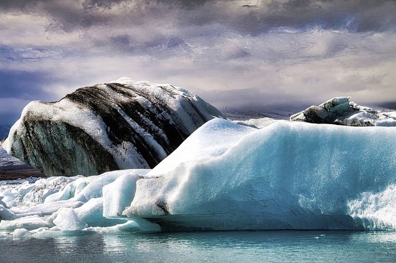 Captured in the ethereal light of an Icelandic dawn, the icebergs stand as ancient, floating monoliths against the backdrop of a seemingly endless expanse of sea. Their surfaces, scarred by the journey from glacier to sea, shimmer with a thousand shades of blue, reflecting the purity and coldness of...
