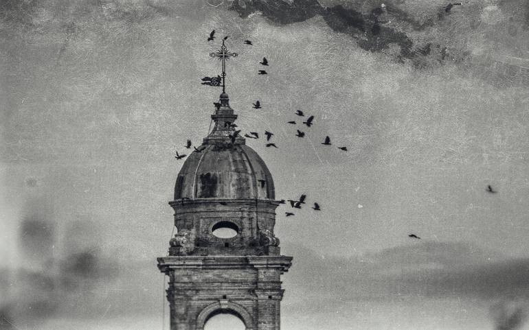 Ancient bell tower, near Siena, in the street of Certosa, photo taken in September, manipulated and retouched, when migrating flocks.