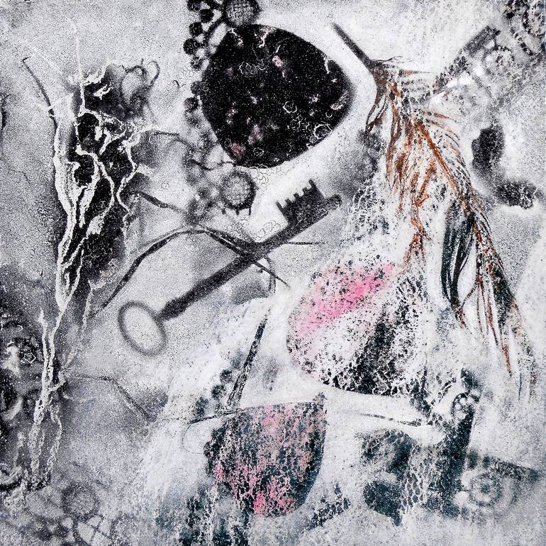 In this fusion of keys, feathers, and organic shapes, a tale of openings and closures unfolds. Each element is a fragment of a cosmic puzzle, inviting the observer to decipher the hidden mystery in a delicate balance of tones and textures. On this icy canvas, like a page of winter, subtle and fragil...