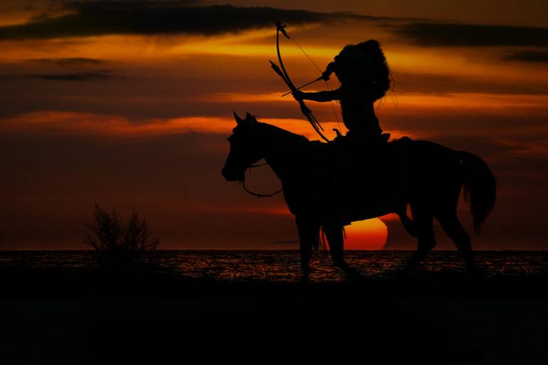 The photograph captures a breathtaking silhouette of a lone Indian archer on horseback, set against the backdrop of a stunning sunset. The Indian, poised and ready with a bow and arrow, exudes a sense of timelessness and tradition. The golden hues of the sunset blend seamlessly with the deep blues o...