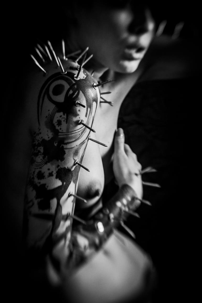 natural woman body. nails fixed on the body. expression of pain ans infection.