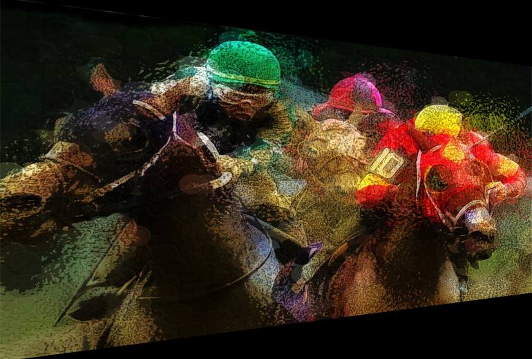 An abstract image of three thoroughbreds coming out of the final turn up close and personal as they vie for position entering the stretch at Saratoga Race Course.