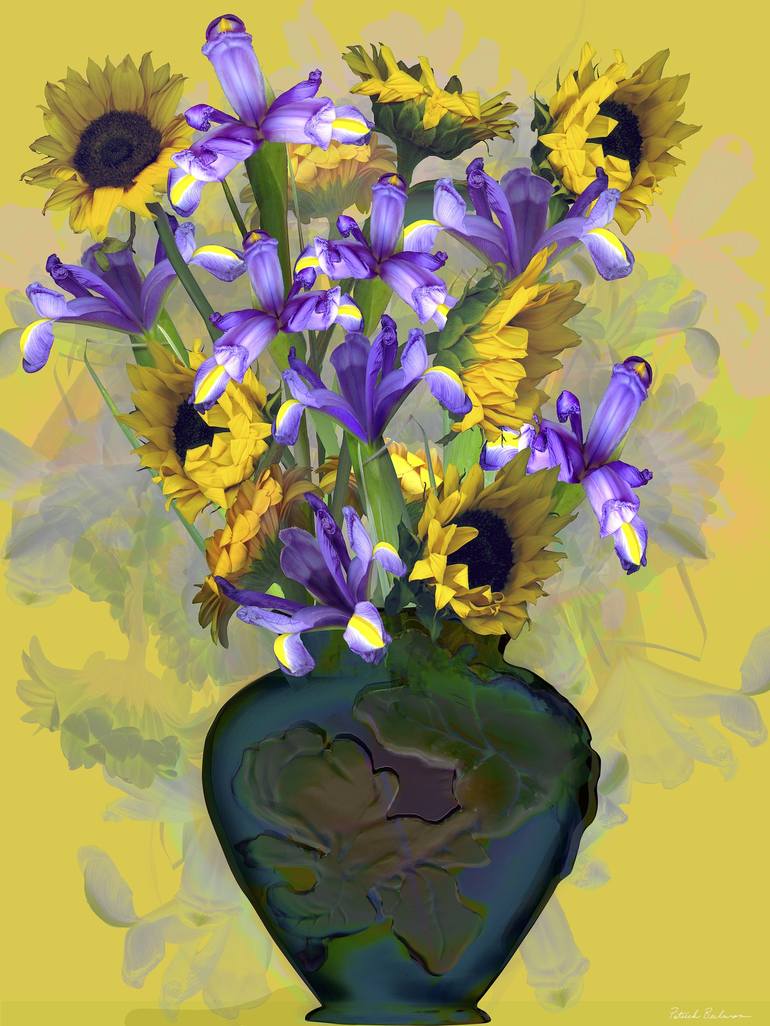 "Iris Sunflowers in Vase 1" is an arrangement of scanned individual flowers and vase using a desktop scanner and arranged digitally. The relatively shallow space is suggestive of icons or bas relief. An inherent beauty of flowers, is augmented by the bright pop of Contemporary color and sometimes ac...