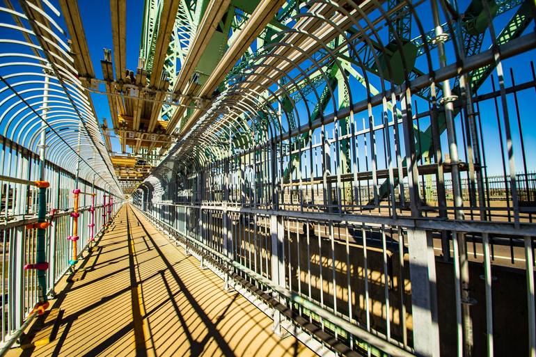 Walking on Jacques Cartier Bridge modern industrial cage Montreal Canada