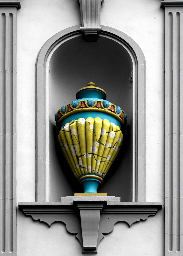 Shot in black and white and painted with colors, a view on some urban details representing some character, animal, flower or another elements digitally transformed to create a new interpretation.