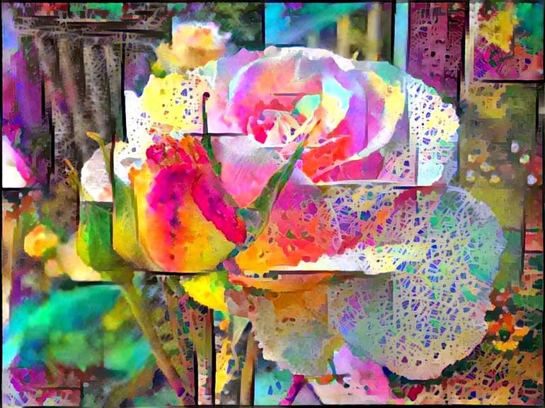 Limited edition Giclée print on Ilford textured paper (cotton). Edition 1 of 10, signed and numbered by the artist. Size: 67.5 x 90cm. My 'Jardin Magique' series combines a number of unique art filters to produce a vibrant and magical, textured rainbow effect. These beautiful Sweet Sonata pink ro...