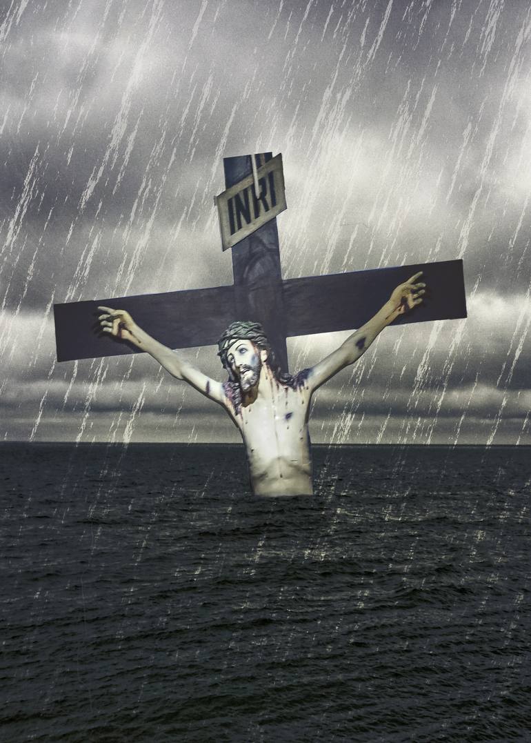 Digital photo collage technique religious concept illustration showing a sculpture of jesus christ on the cross drowning in the middle of sea.