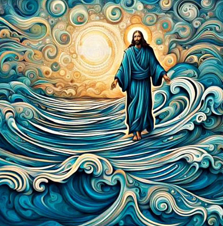 A.I. created interpretation from my description of Jesus Christ walking over rolling waves of the sea as the sky is filled with whirling clouds and a bright shining sun.