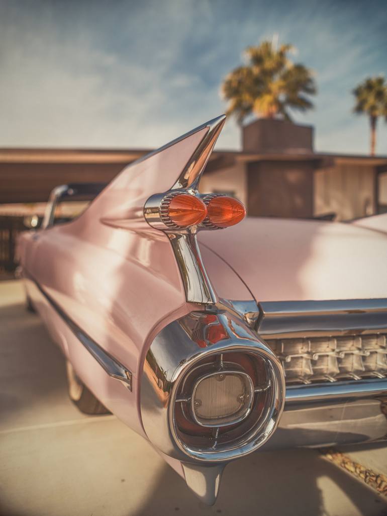 A pink 1959 Cadillac Coupe DeVille in front of a mid-century home in Palm Springs. CA.