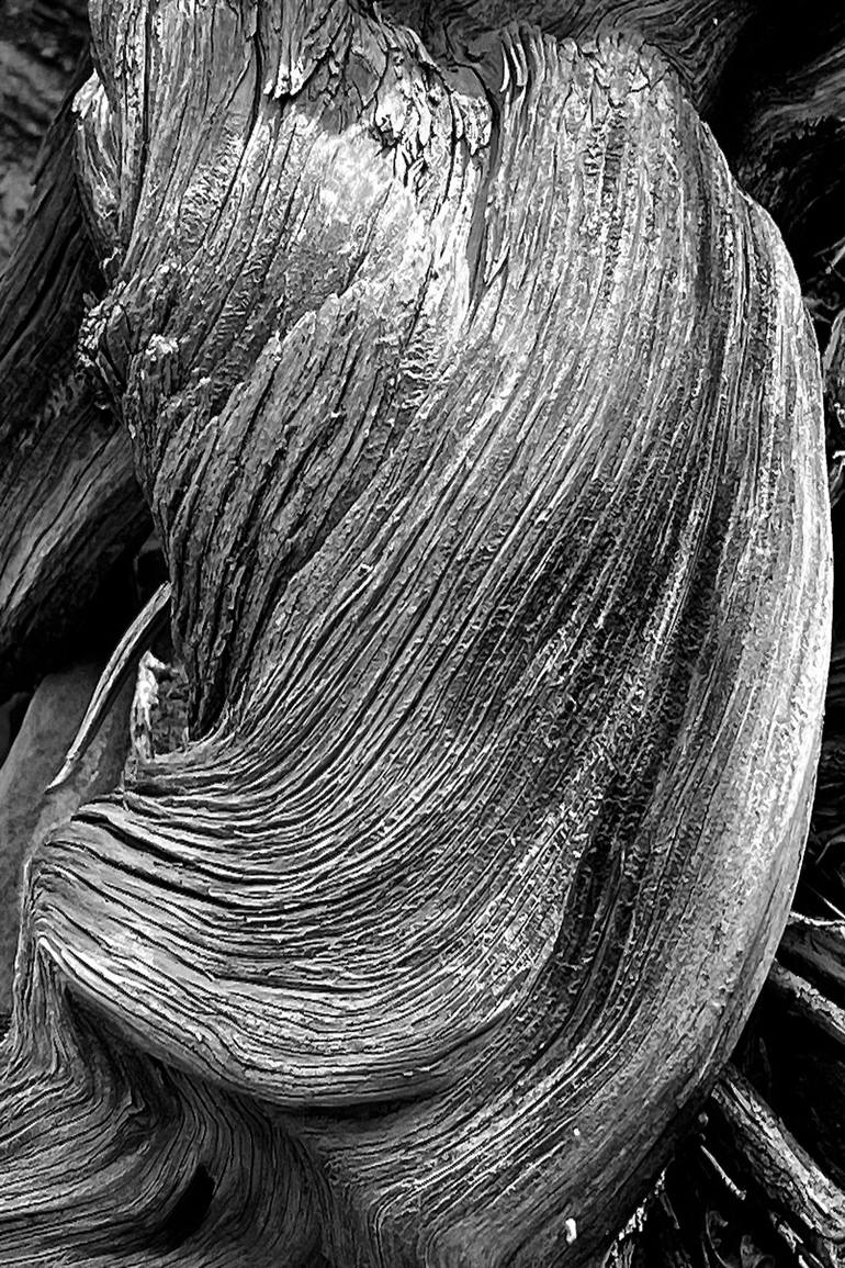 A black and white close up image of a dead Juniper tree with it's gnarled swirling and contorted trunk baked in the hot Southern Colorado sun. The image is manipulated to enhance the scaly nature of the sun baked wood.