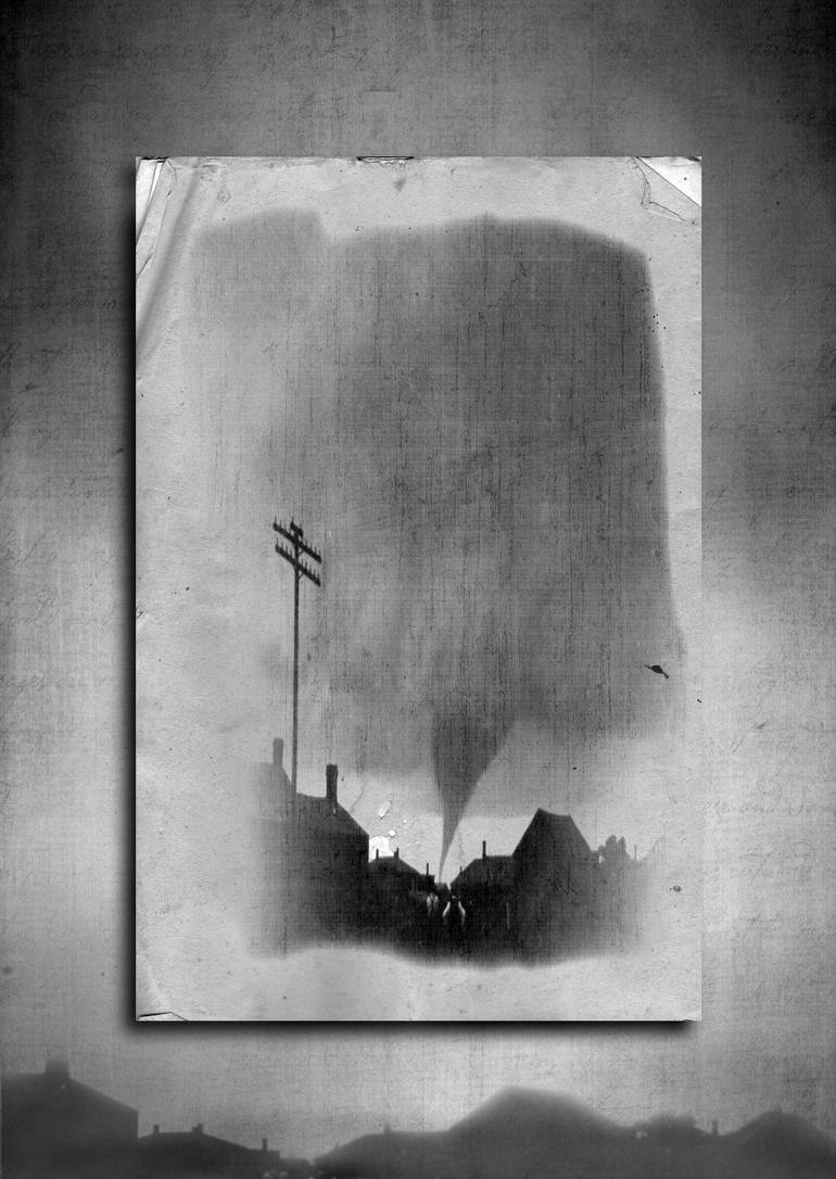 An approaching tornado in this multilayered piece from Edward M. Fielding's series "Visual Poetry". Black and white image with textures and layered imagery.