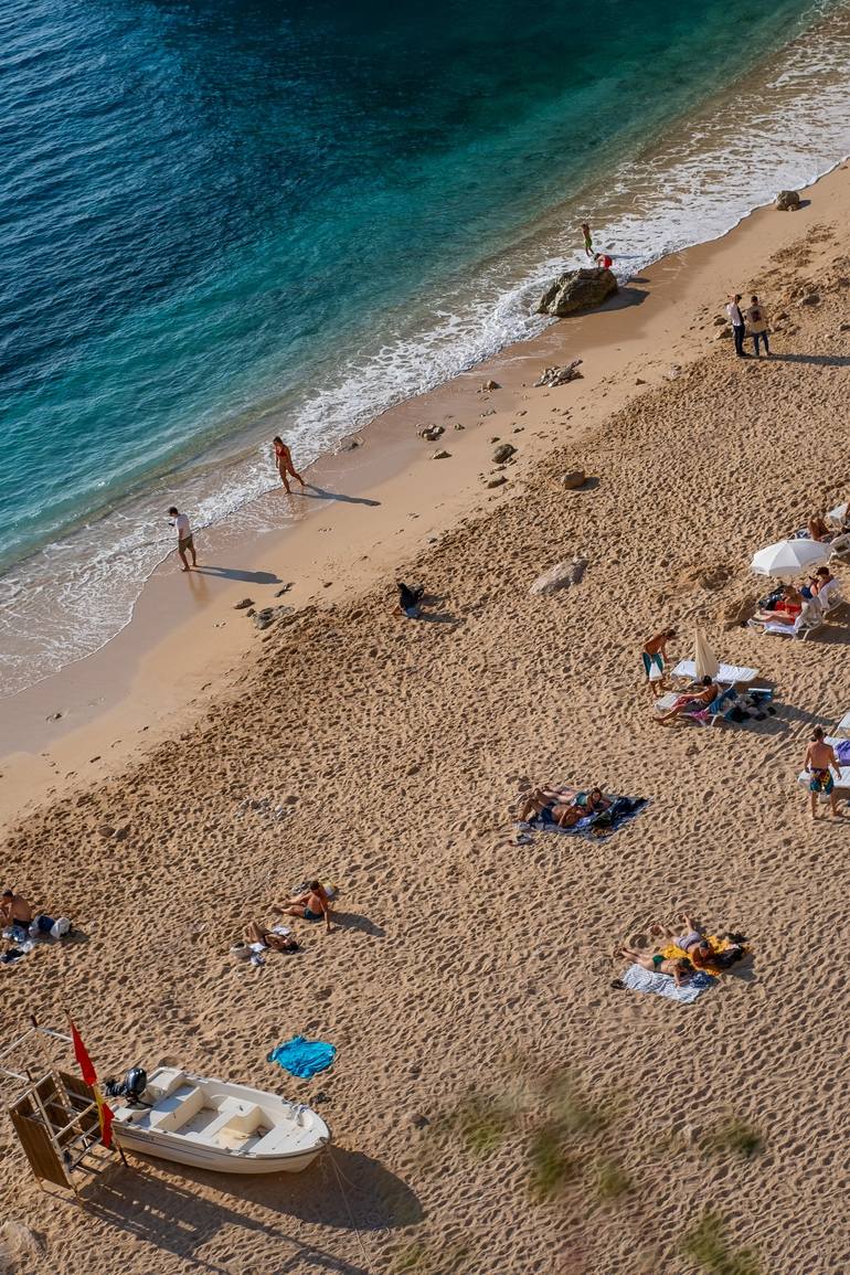 This photograph captures the stunning beauty of Kaputas Beach in Kas, Turkey, a renowned destination known for its golden sands, turquoise waters, and serene atmosphere. Shot from above, the image offers a bird's-eye view of sunbathers relaxing on the sandy beach, swimmers enjoying the clear waves, ...