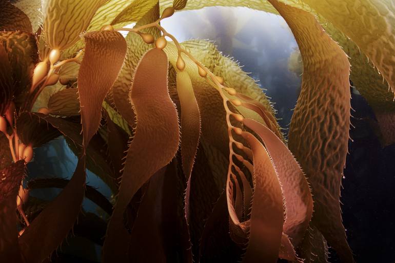 A close-up image of Giant Kelp off the California coast juxtaposed against a milky sea with diffused sunlight penetrating the gaps.