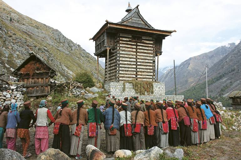 People in Kinnaur gather after harvest to thank the local deity enshrined in the temple in the background. They turn out in their finest costumes and dance for hours on end.