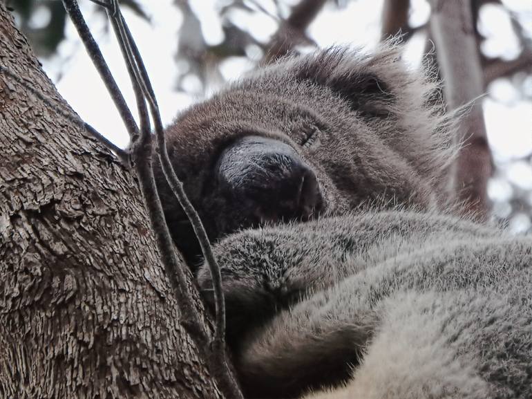 Limited edition Giclée print on Ilford textured paper (cotton). Edition 1 of 10, signed and numbered by the artist. Size: 67.5 x 90cm. This artwork is based on my original photograph of a cute Australian koala, sleeping peacefully in the fork of a gum tree near my home. I have applied various dig...