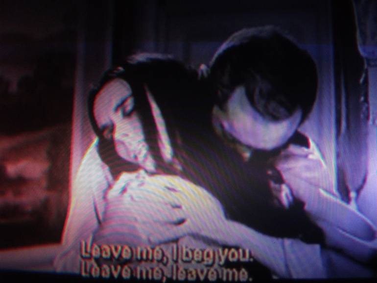 PHOTOGRAPHIC IMAGE TAKEN FROM TV FROM THE FILM:TERROR CREATURES FROM THE GRAVE(65)IT.(PUBLIC DOMAIN) WITH BARBARA STEELE CONVEYING THE MADNESS OF DESIRE WITH ORIGINAL SUBTITLES FROM FILM. ANOTHER VERSION ALSO AVAILABLE.