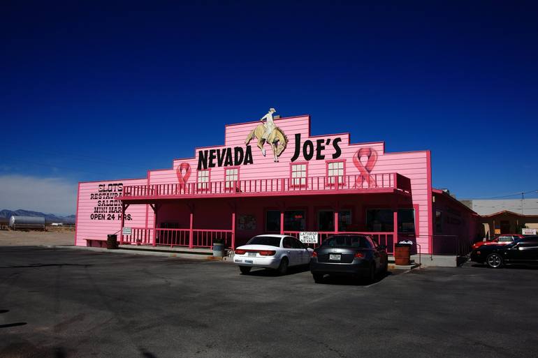 Gas Station and store in remote Nevada. A strikingly pink building with bold signage reading "NEVADA JOE'S" stands under a clear and deep blue sky.