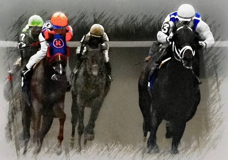 #3 Seanow with Jockey Luis Saez leading the entire way at the top of the stretch at Saratoga in Race 4 July 17, 2019, only to be overtaken in the end at the wire by #8 The Sicarii.