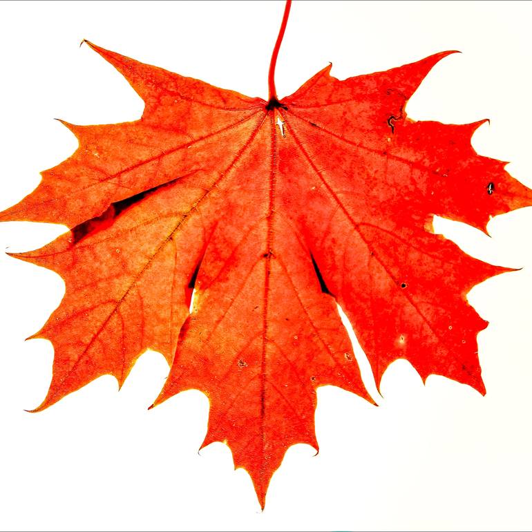 "Leaf # 1" is a beautiful, square format photograph from a collection inspired by colorful Autumn leaves. Crafted using photogram and C-type techniques, this print showcases a minimalist aesthetic with a modern sensibility. The red hues evoke the cool, crisp air of fall, bringing the organic beauty...