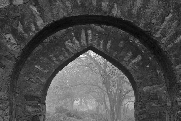 An age-old archway frames some trees in the distance on a foggy, winter day in a heritage site in Delhi, India. This passage seems to open new dimensions in time and space. And those trees yonder could well be the trees of life. This image is part of a black and white triptych which forms a collecti...