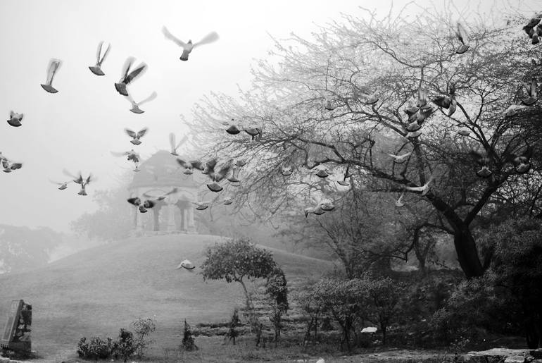 A flock of birds take flight, forming an impromptu circle, against the distant backdrop of an age-old domed pavilion on a foggy, winters day in a heritage site in Delhi, India. That avian circle could well be the circle of life traversing time and space. And let's not forget the trees of life that a...