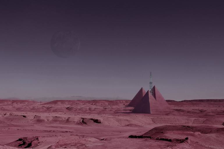 Life on a marooned planet Mars with abandoned pyramids radio tower and planet Earth in the distance