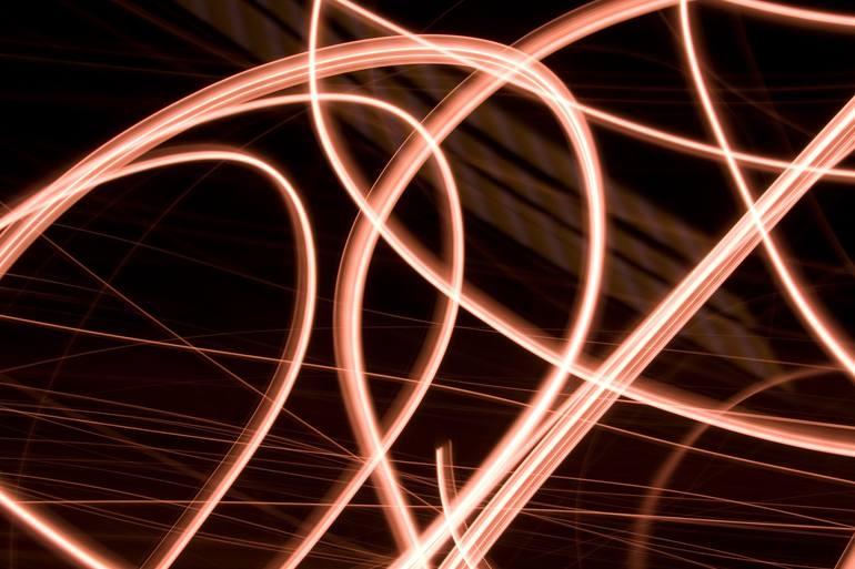 Long exposure digital photos created in a classic car museum. Each light streak is either a source of light or the reflection of lights on multiple cars inside a black, museum gallery. The cars help create the different colors of lights.
