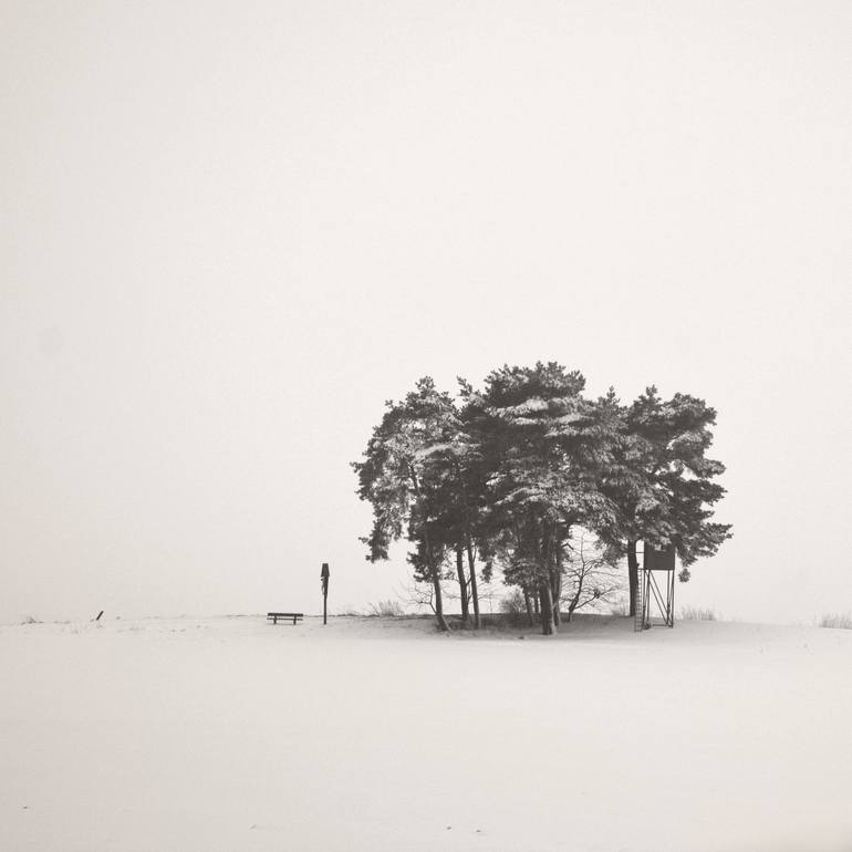 Photography of a wintry landscape with a bunch of trees in minimalist style in black and white. Fine Art Prints on Hahnemuehle (308 g/cm, cotton) are available, Limited Edition of 25.