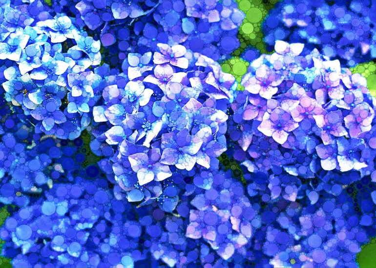 A photograph of blue hydrangea turned digital pop art in a modern pointillist style, using the magic of blueberry pancakes and the breath of a large fairy. I used rich, saturated hues of periwinkle blue, aqua, cobalt blue, lavender, lilac purple and apple green in my colorful ornamental flowering bu...