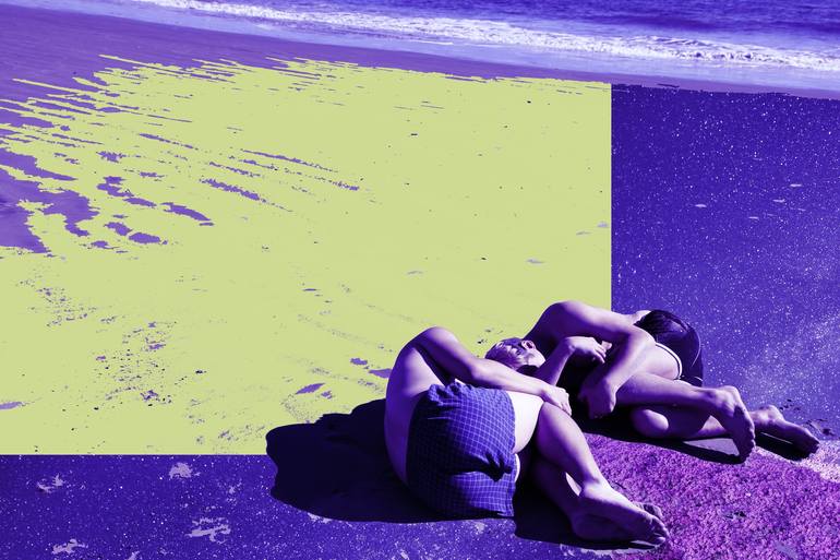 This is "Sunrise and Sunset - {$M}" from 2021. A series of artworks. Sunrise and Sunset is an exploration of time, impermanence, and human presence within the digital sublime. This series of six glitch-art compositions captures two anonymous figures reclining on a beach, their forms dissolving and r...