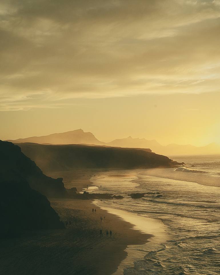 Bathed in the golden glow of the setting sun, this breathtaking coastal landscape captures the serene beauty of nature. The soft mist rising from the waves merges with the warm hues of the sky, creating a dreamlike atmosphere. Jagged cliffs stand in contrast to the gentle shoreline, where silhouette...