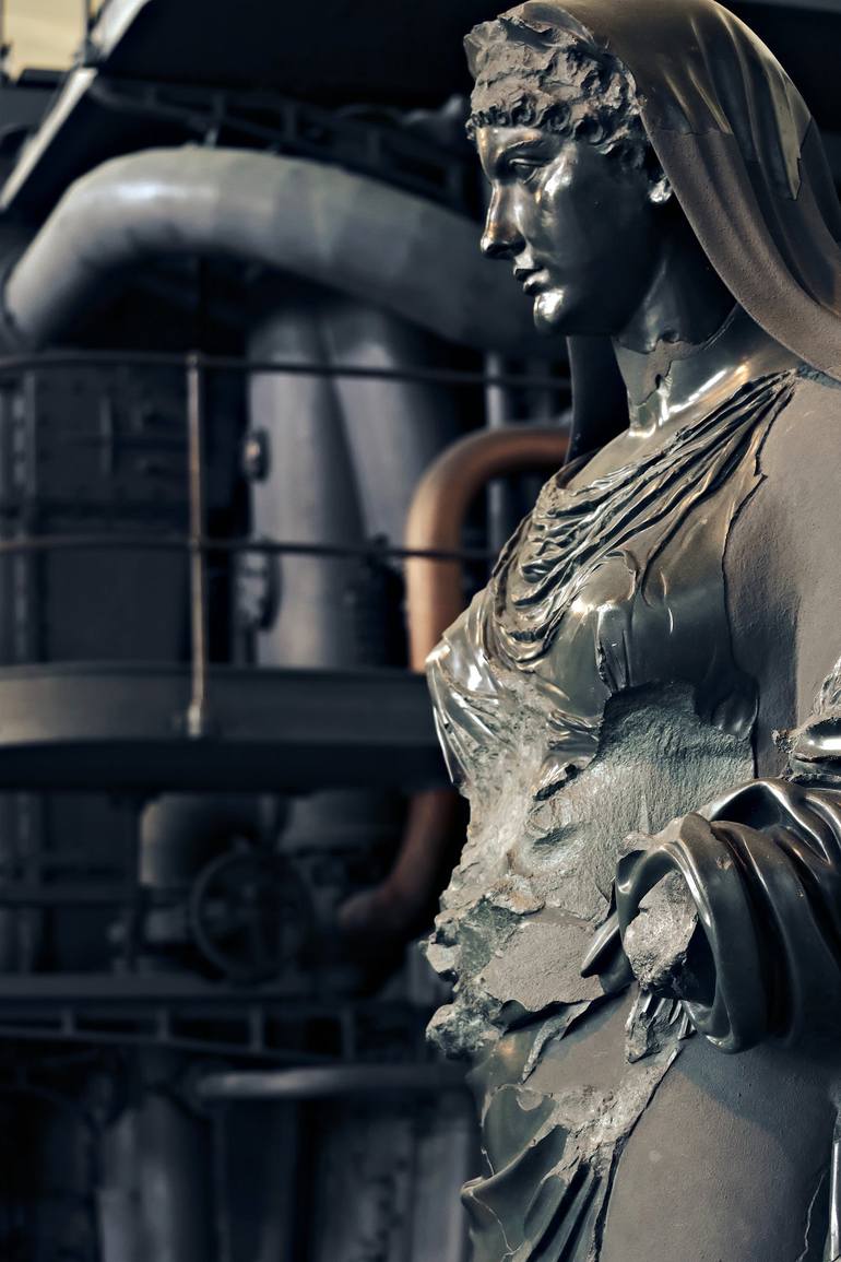 In this evocative photograph, the statue of black marble depicting Agrippina stands elegantly amidst the intricate pipes of the boilers of the ancient Centrale Montemartini in Rome, now transformed into a museum. Her imposing and majestic figure contrasts with the backdrop of industrial archaeology,...