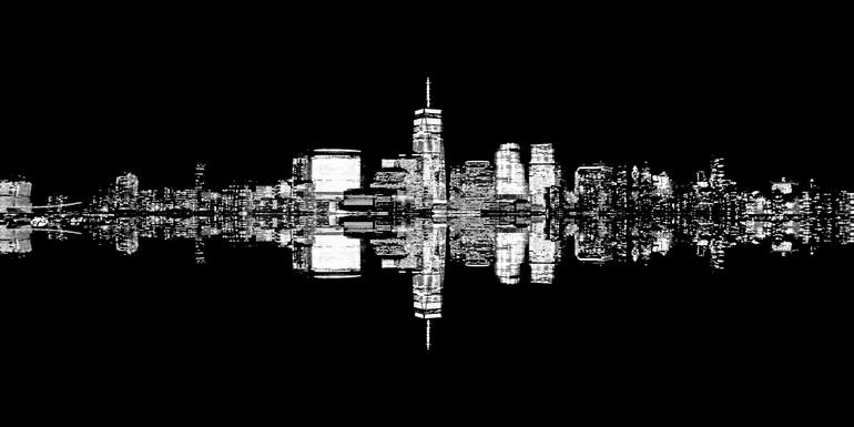manhattan skyline, new york, ny, new york city, night, evening, dark, skyline, scrapers, city lights, river, lower manhattan, night, evening, reflection, buildings, america, usa, united states of america, american, us, americana, bright, colorful, striking, windows, reflect, water,, black and white,...