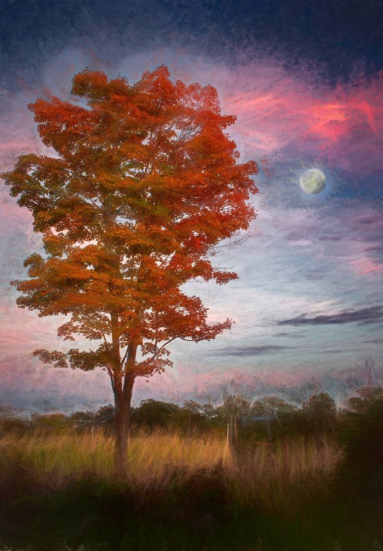 A full moon hangs in the sky next to a beautiful orange maple in fall foliage. This image was captured just outside my new home in Bath, NH. Printed in a limited edition of 25 signed originals 16"x24" on fine art rag paper with archival inks.