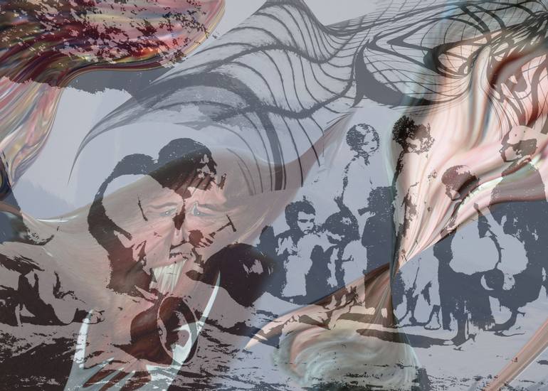 Am Boden sitzender Mann mit Hammer in der Hand, umgeben von Kindern, grauweiß. Integrierte halbtransparente graue wellige Linien und verschiedenfarbige Flächen, eine ist ein Gesicht mit langen Zähnen.