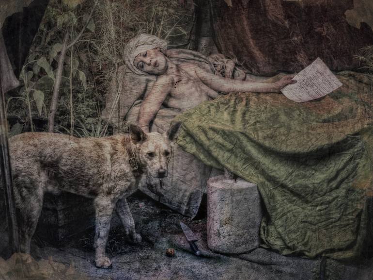 Maurice has a good nose for character. His owner, my old girlfriend and model here, believes he is a real dingo (nb his front footed splayed out stance). He was in only 2 frames of the perhaps 30 I shot of Chala as Marat in her backyard Silver City bath tub, but he made the picture come into focus a...
