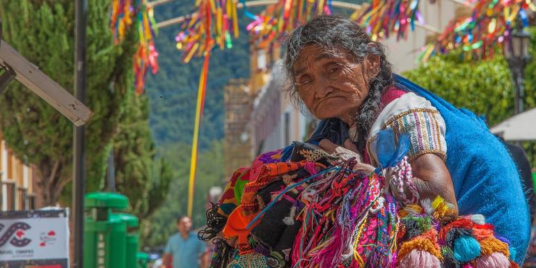 Portrait of old Maya woman selling local craft on the street of San Cristobal De Las Casas in southern Mexico.