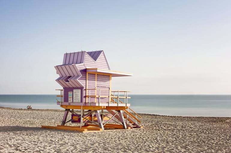 No lifeguard on duty..... (this is a variation on Miami Beach #056) One of the newer lifeguard stands by architect William Lane on Miami Beach. A mix of the optimistic futurism of Art Deco and traditional Florida Cracker style wrapped in popping tropical colours. Unframed - 24x16 in. Limited edi...