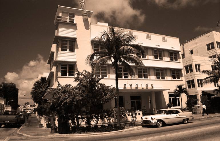 An old old Oldsmobile basks in the South Beach sun on Collins Avenue. This classic auto was parked in front of the Avalon Hotel. A classic film image, softer of focus with maybe some lovely film "grain". Sepia photo.
