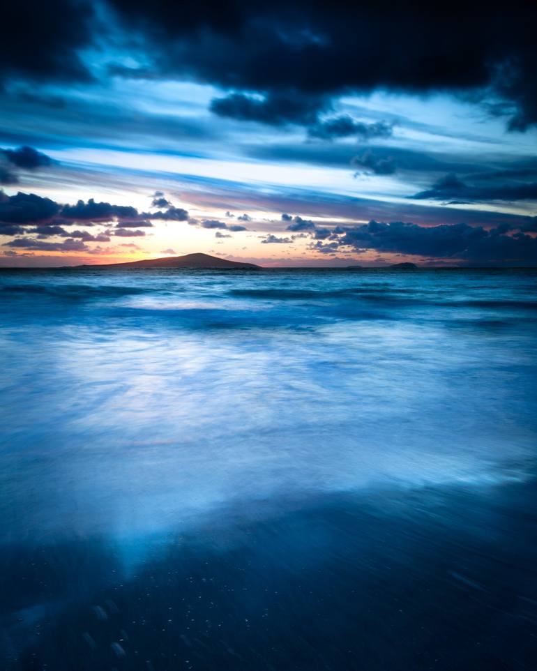 In the deep night on a deserted beach, the sun goes down over a small island. Beautiful shades of pink and red make a soft backdrop against which the small island of Pabbay sits on the horizon. This image in shades of pale blue and dark midnight blue is both dramatic yet calming. Made on a gentle ev...
