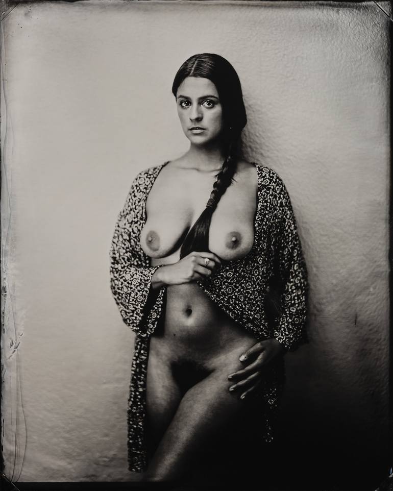 Nude portrait of Misuzu in her robe. This is an 10"x8" Tintype, made on anodised aluminium using the Wet Plate Collodion method of the mid 1800's. This is the original Plate and not a copy or print. The plate is then framed [framed size 18.5"x15.5"x1.25"] - in a white frame, floating with a generous...