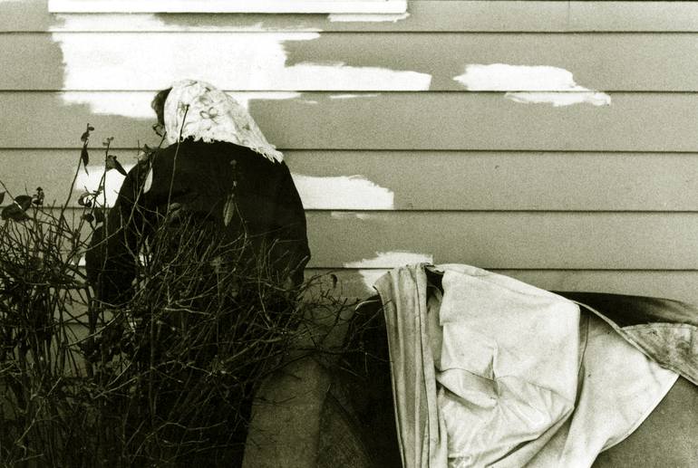 This is a portrait of my mother. Yes, she routinely wore the headscarf. She is always busy, constantly doing something. In this case she was priming the house to paint, during the winter.