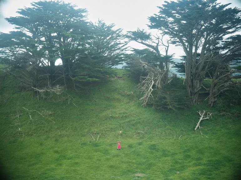 This photograph emphasizes the vastness of the natural world and the relative smallness of human presence. A lone figure, clad in a vibrant red dress, stands at the bottom of a grassy slope, dwarfed by the towering trees and the rolling hills beyond. The image evokes a sense of awe and wonder at the...