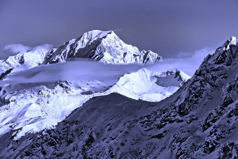 Mont Blanc viewed from Les Arcs Paradiski ski area Savoie Tarentaise valley in the French Alps France photography by Andy Evans Photos. Limited edition prints are processed using Hahnemuhle Baryta fine art paper. A bright white based, acid-free and lignin-free paper benefiting from a high-gloss prem...