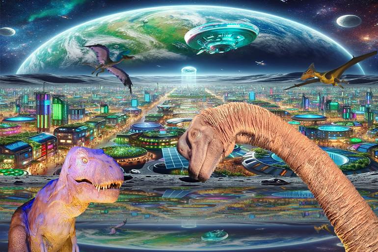 After visiting a dinosaur exhibition, I wondered how we might live among them again in the future. I used my photos, AI, and other digital tools to develop this composition of a future Moon City featuring the Earth rising in the horizon with dinosaurs nearby. The water between the city and the dinos...